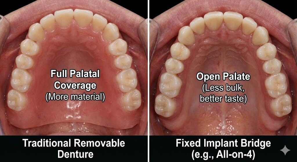 許多患者擔心假牙會有「異物感」。下圖展示了固定式假牙(如 All-on-4)與覆蓋式義齒在上顎設計上的關鍵差異: