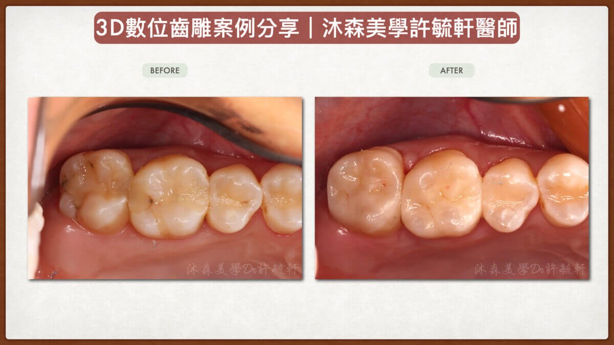 3D齒雕又稱為陶瓷嵌體,應用於大範圍的蛀牙,齒雕為堅硬陶瓷、耐用,且高度擬真自然牙,透光美觀,最要的是齒雕為客製化外型,能降低牙齒修磨,盡保留剩餘的齒質。