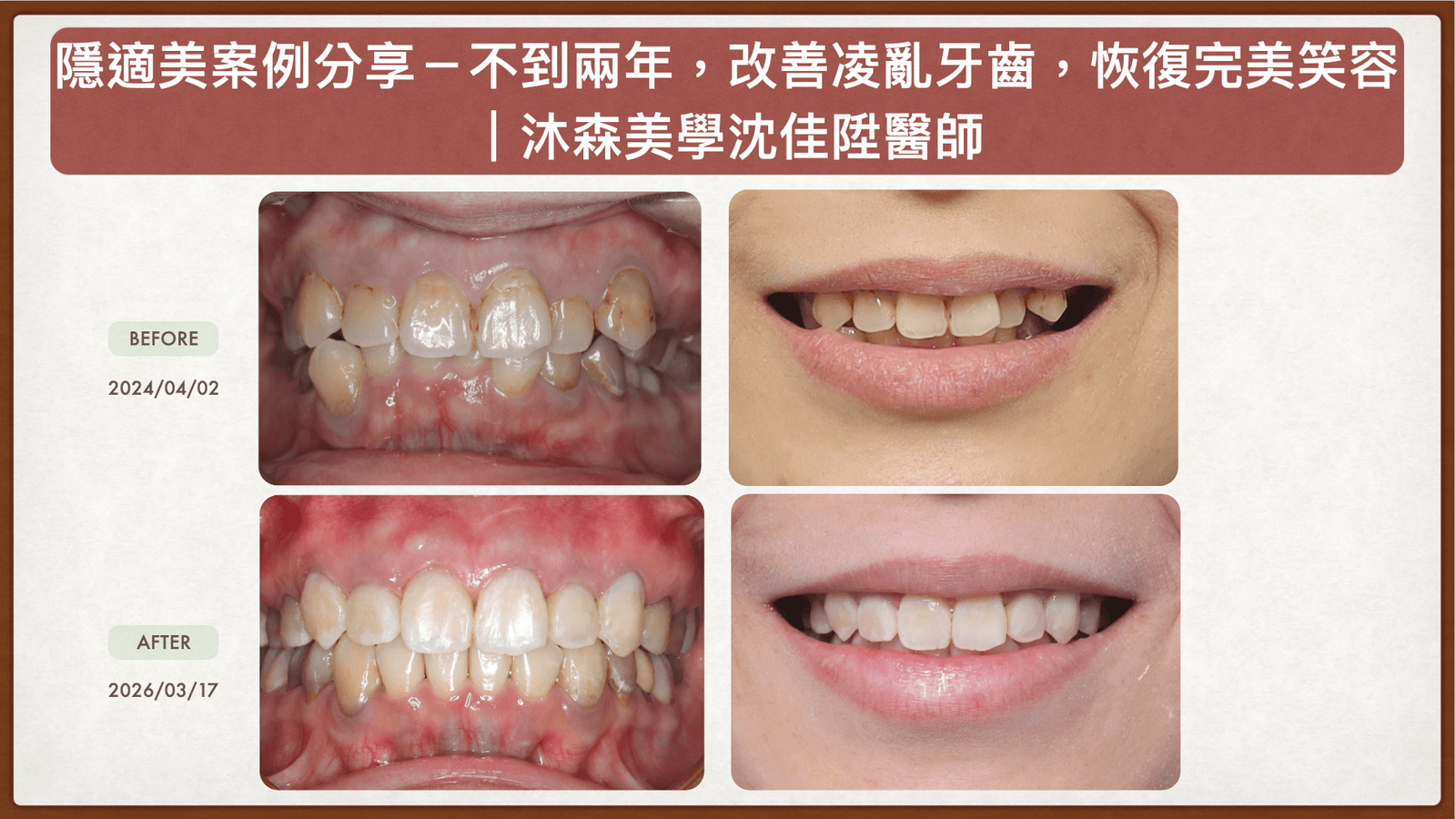 這次分享的案例,就是透過隱適美隱形矯正,在不到兩年的時間內,成功達成牙齒排列、咬合與美觀的全面改善。